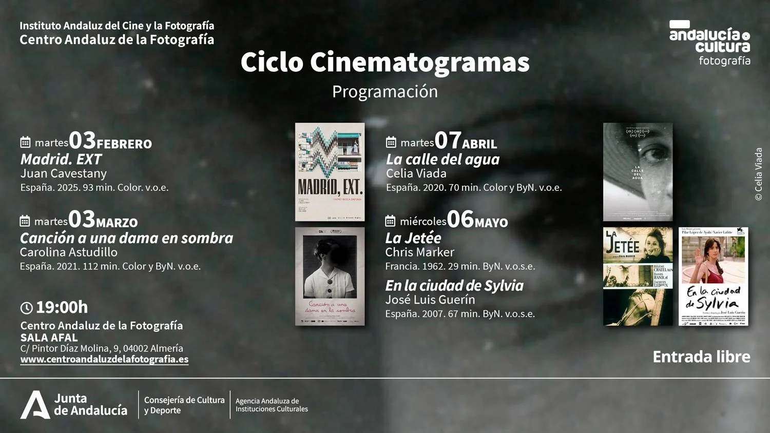 El Centro Andaluz de la Fotografía continúa con el ciclo Cinematogramas, una propuesta que explora las relaciones entre la imagen fija y el lenguaje cinematográfico, prestando especial atención a aquellas prácticas que sitúan la fotografía en el centro del discurso audiovisual.