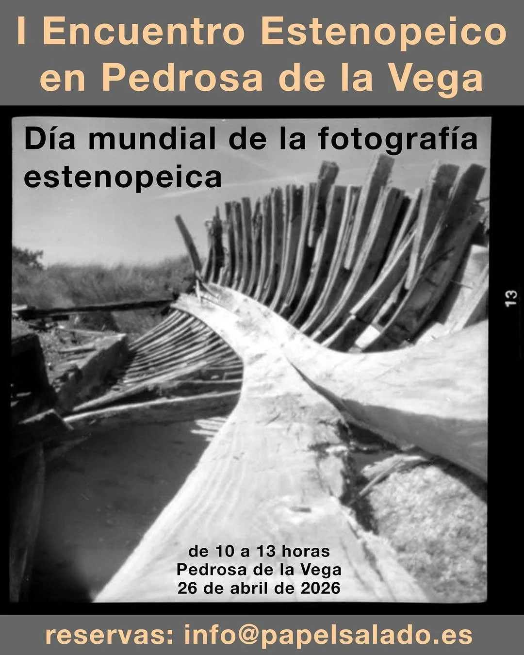 I Encuentro Estenopeico domingo, 26 de abril de 2026 10:00 19:00 Google Calendar ICS Ciudad: Pedrosa de la VegaProvincia: PalenciaLugar: por confirmarHorario: Domingo 26 de abril de 2026Ig: @papelsaladoVen a Pedrosa de la Vega a celebrar el Día Mundial de la Fotografía Estenopeica 2026. En este taller gratuito te meterás dentro de una cámara oscura, construirás tu cámara estenopeica y aprenderás a revelar tus propias fotos. , de 10 a 13 h. Para más información y reservas: info@papelsalado.es