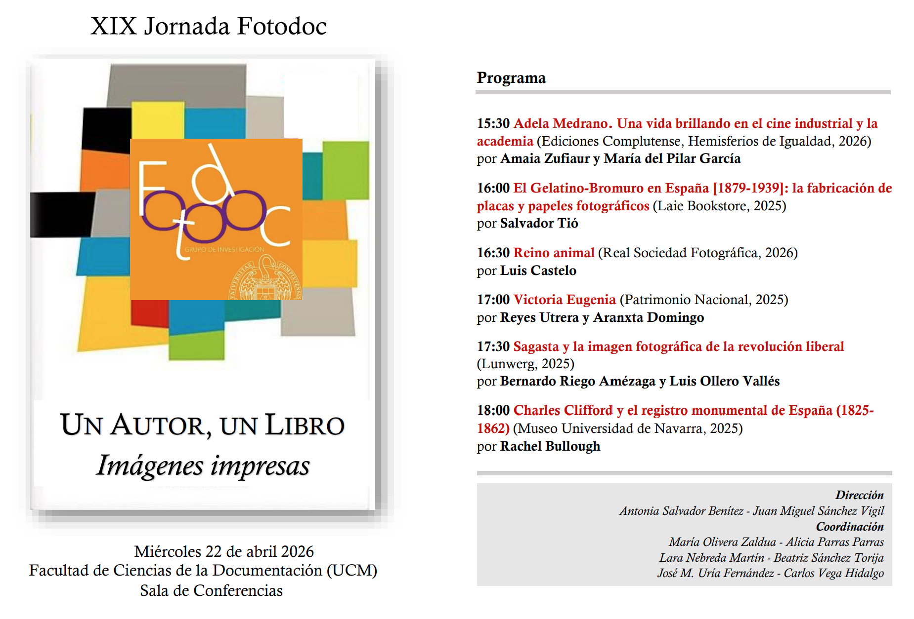 El grupo de investigación FOTODOC de la UCM tiene como objetivo la investigación en materia de gestión y análisis de la documentación fotográfica con un enfoque multidisciplinar e integrador que contempla desde la recuperación y el análisis hasta la difusión, pasando por la preservación y el tratamiento.
