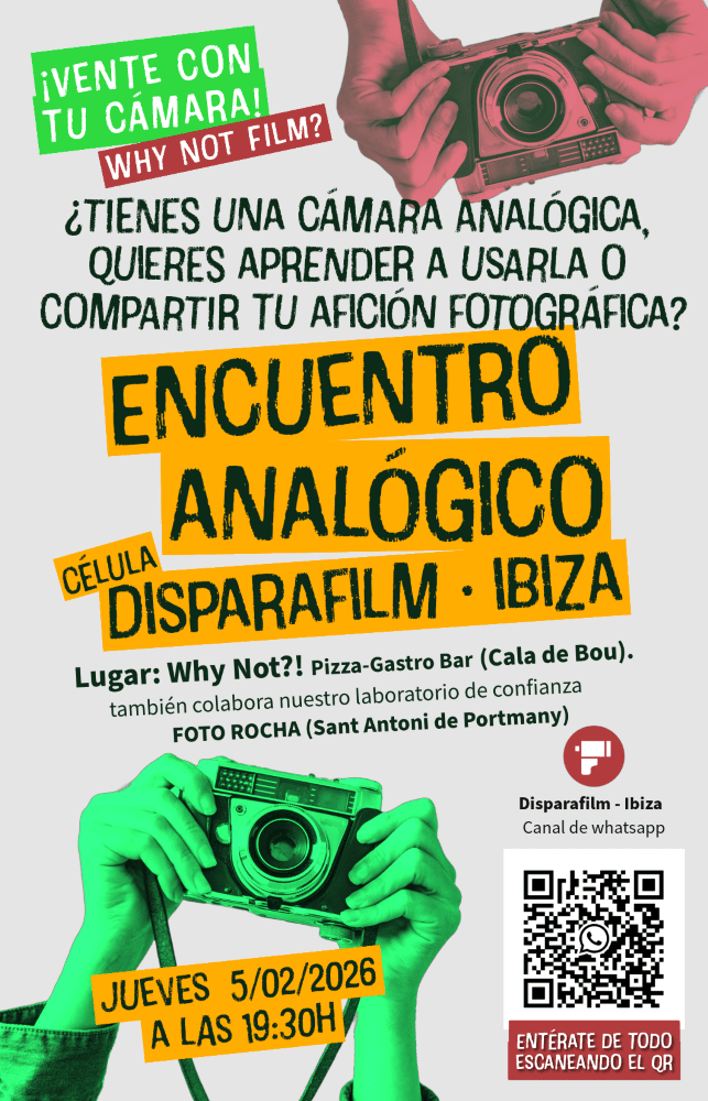 ¿Qué? No importa tu nivel de experiencia, el plan es hacer un chequeo rápido de vuestras cámaras para asegurar que están listas para disparar; cargar carretes en grupo (ideal para quienes están empezando y tienen miedo de velar la película), y echar unas cañas mientras planificamos las próximas rutas fotográficas por los rincones más potentes de Ibiza.