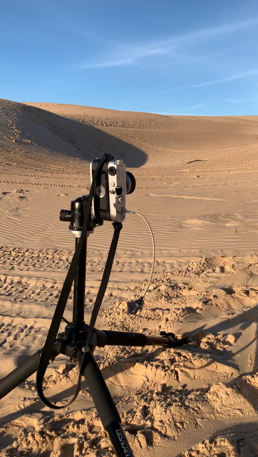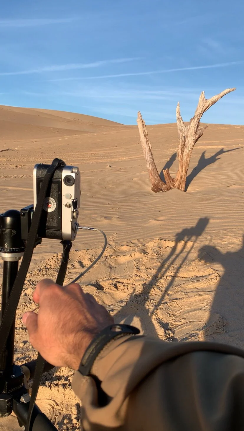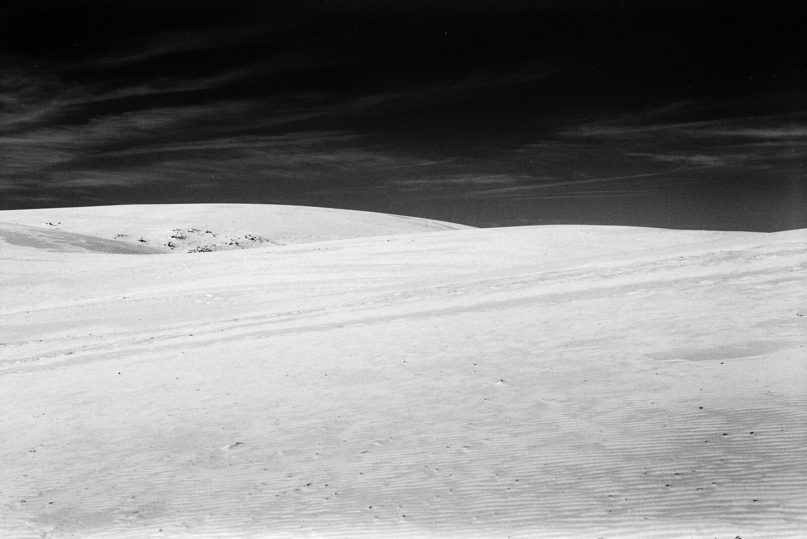 Una escapada de un día. Madrugar para pillar la luna, llegar y encontrarte la duna sin huellas después del temporal. Una cámara mecánica, un filtro rojo y película en el bolsillo. A veces la fotografía analógica funciona mejor así: con un propósito claro y dejando que el medio y el momento hagan el resto.