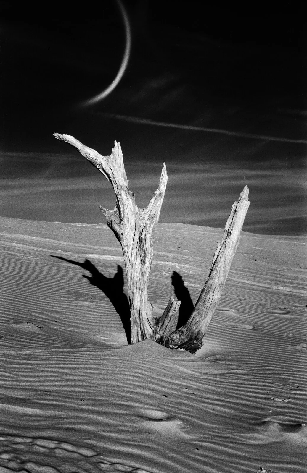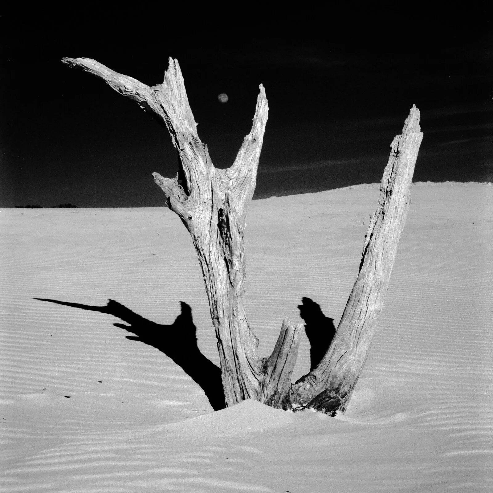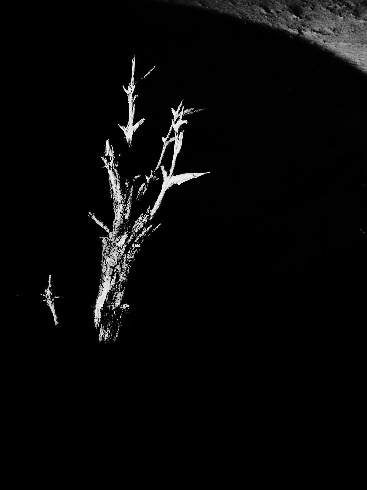 Esta es la más extrema del carrete, causada por los primeros rayos del sol que aún no iluminan las dunas por completo. La madera emerge de una sombra tan profunda que el encuadre es casi todo negro. Solo queda la silueta blanca de las ramas contra la nada.