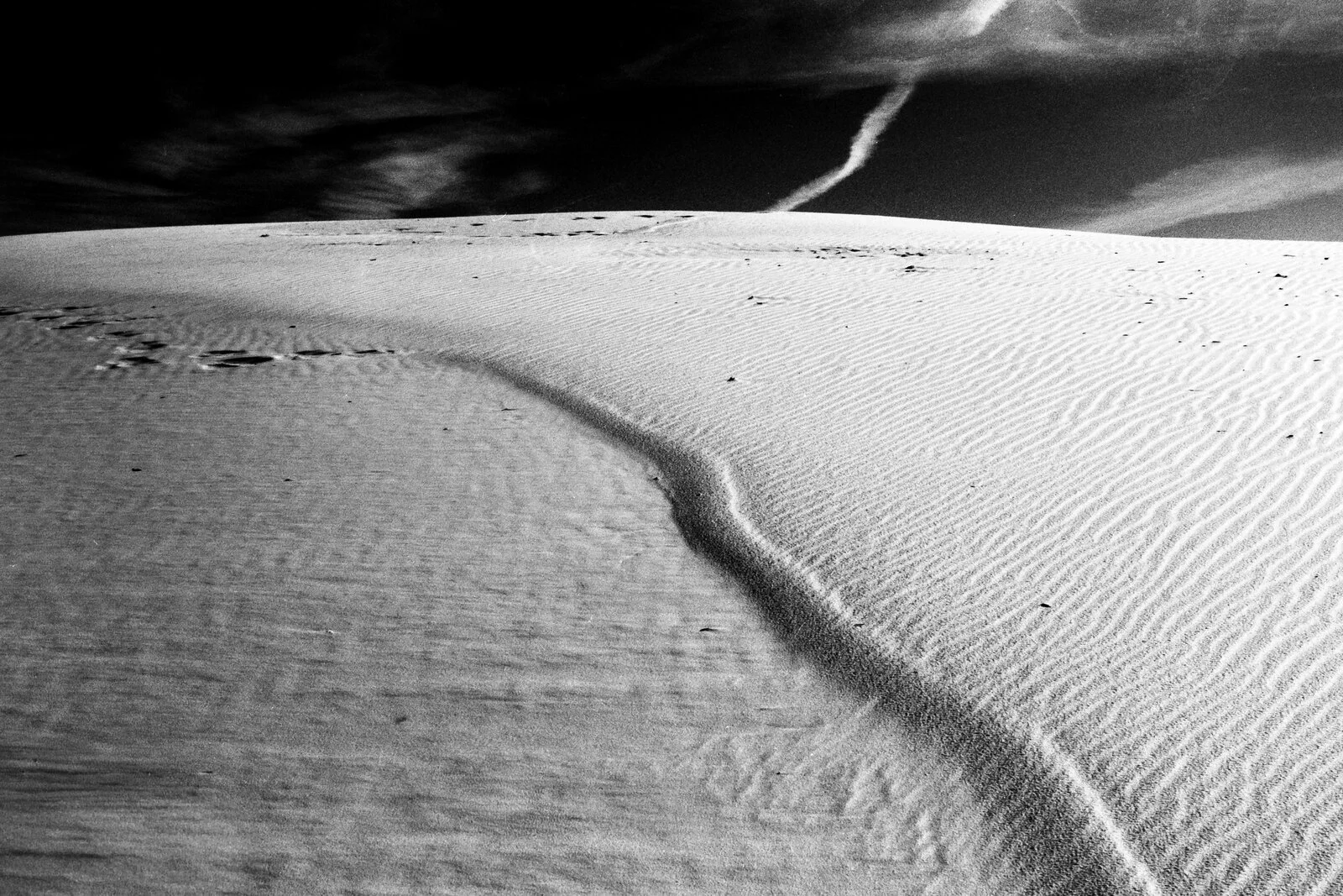 Una vista más amplia, con la curva de la duna ocupando casi todo el encuadre y el cielo negro aplastando desde arriba con la estela de un avión que genera simetría. Cielo y duna conectados.