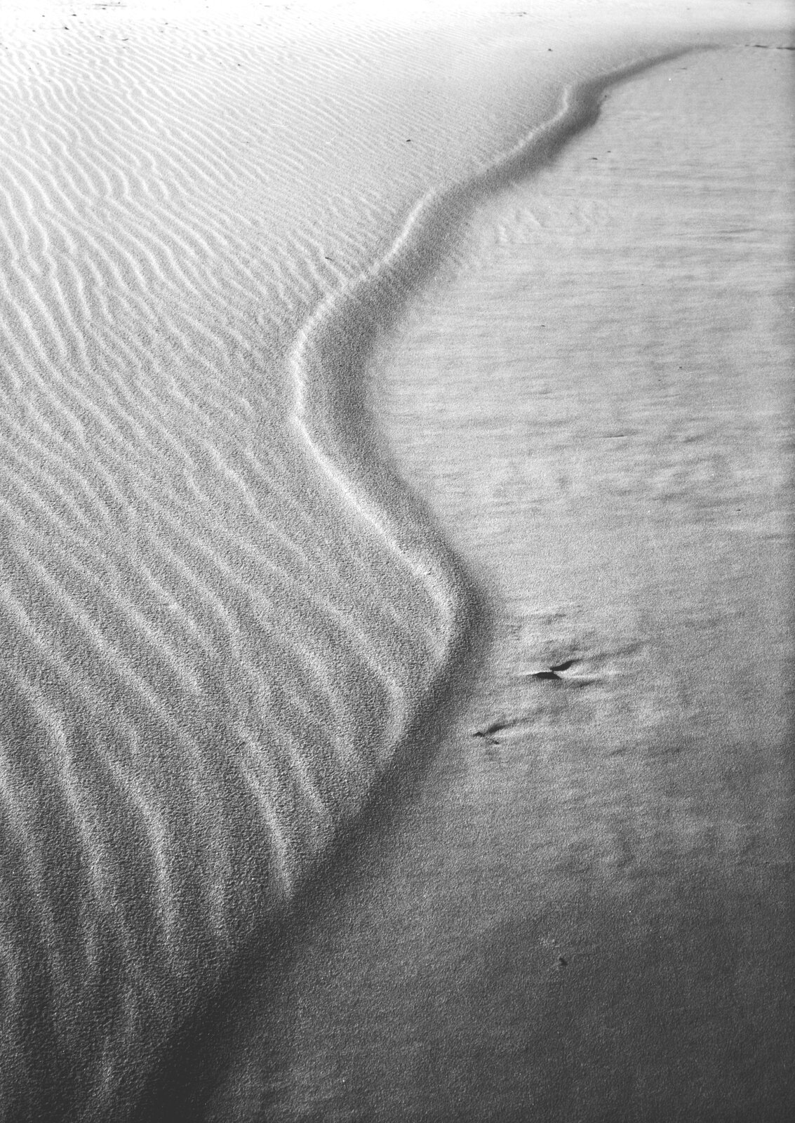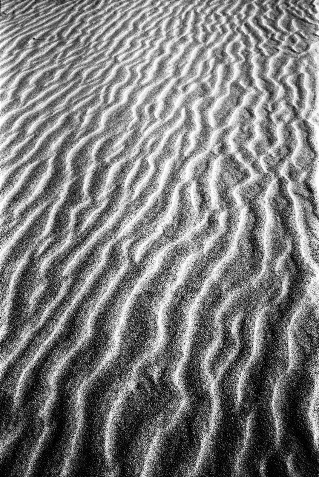 Empiezo por aquí porque esta foto resume bien lo que buscaba ese día. No hay horizonte, no hay referencia de escala, no hay nada que te sitúe en un lugar concreto. Solo la arena recién reconfigurada por el viento después de la tormenta, con esas ondulaciones que se repiten como un patrón infinito. El Fomapan forzado añade rugosidad sobre rugosidad. Podría ser el Sáhara. Podría ser otro planeta.