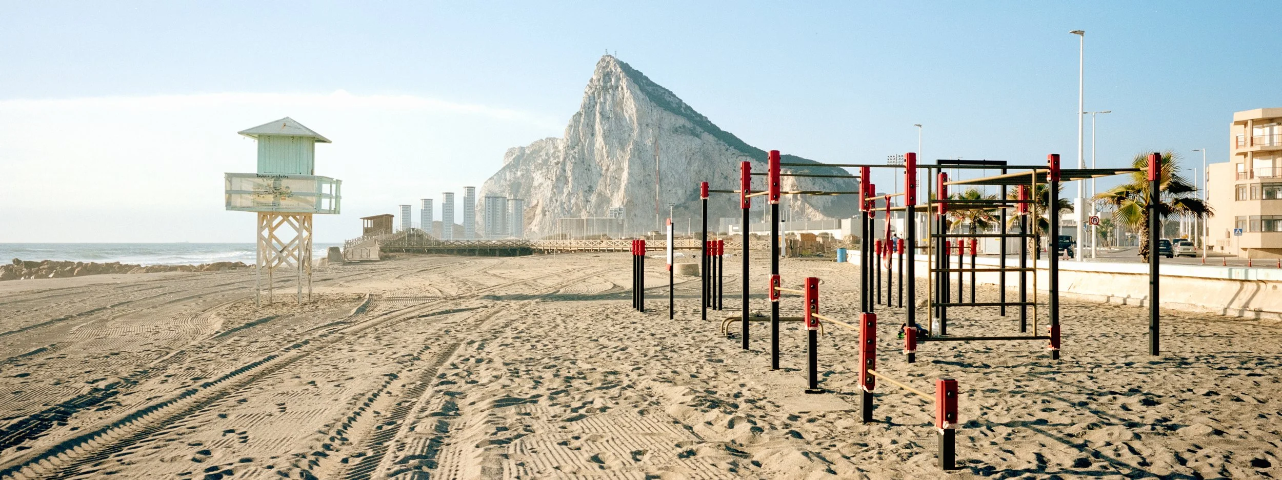 El formato panorámico de la Xpan fue perfecto para capturar esa tensión entre lo monumental del Peñón y lo cotidiano de la vida local.