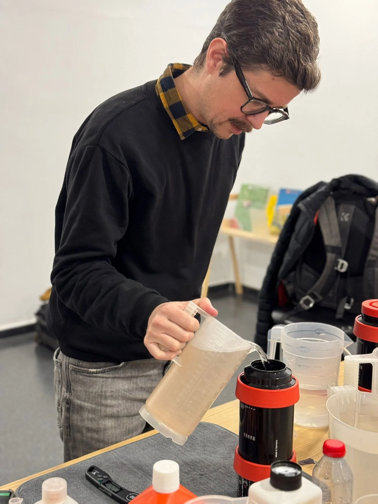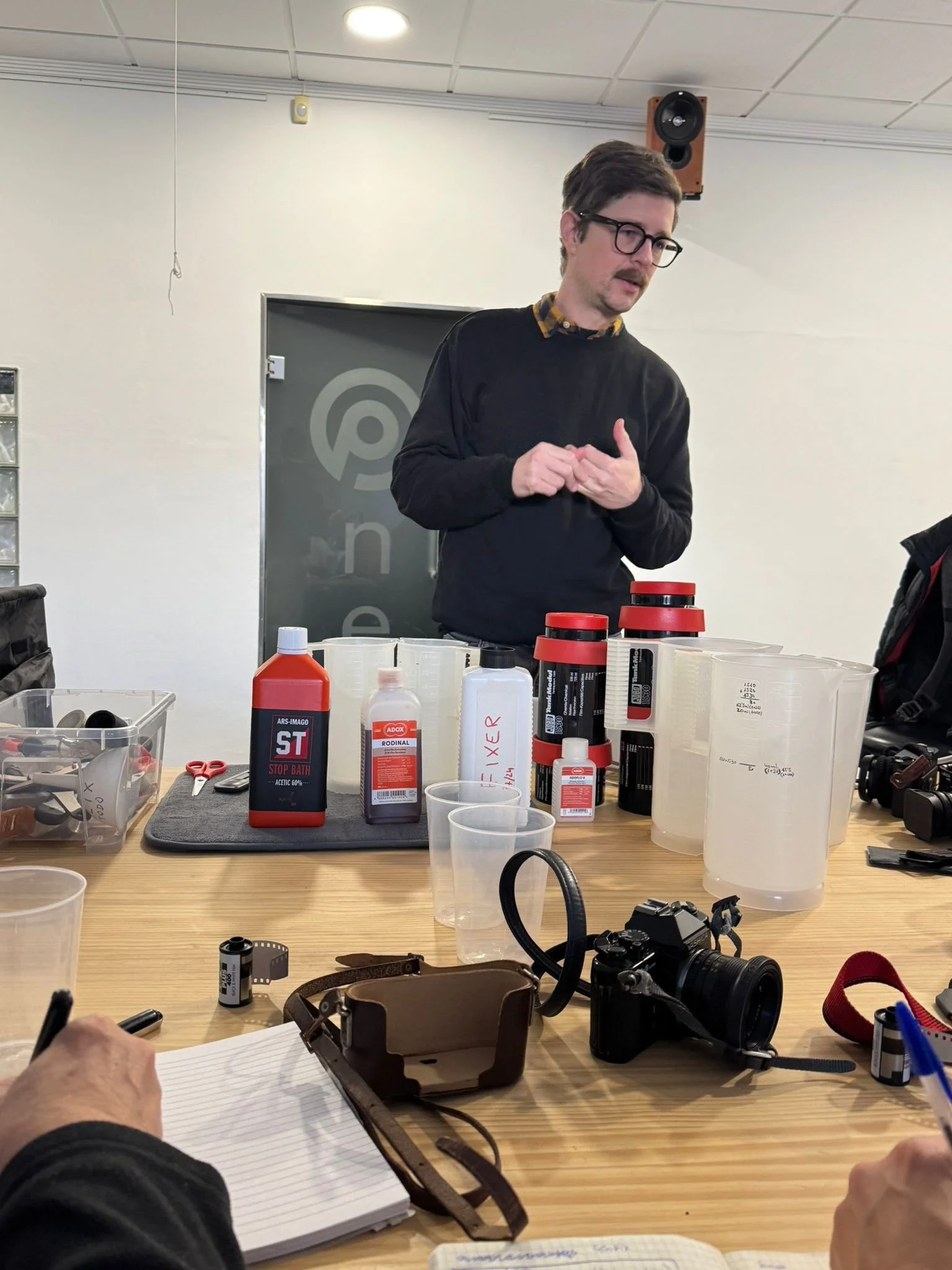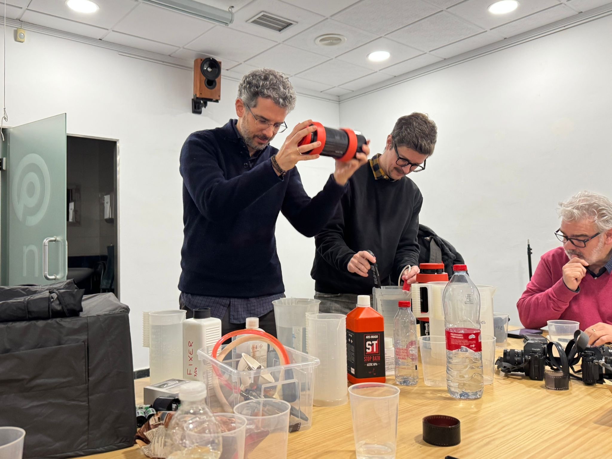 Volvemos a la sede de la asociación. Para qué quieres café cuando tienes Rodinal! Nos ponemos manos a la obra. Este no es un taller específicamente de revelado, aún así me gusta explicar el proceso de forma que quien tenga ganas de aprender, sea capaz de comprar el material y revelar en casa. De hecho en el taller todo el mundo se pringa!