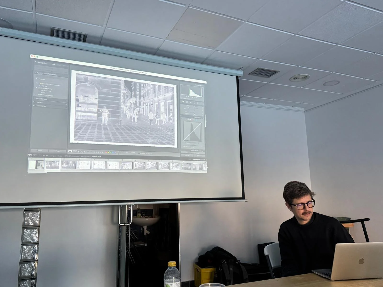 Este taller es largo, unas 16 horas. En el primer día de taller (viernes por la tarde), empiezo con una reflexión acerca del proceso de fotografiar. ¿Qué sentido tiene disparar fotos en la calle si no sabes por qué lo haces? Para ello, cuento mi experiencia personal, hablo de cómo paso de casi abandonar la fotografía harto de pantallas, menús y tutoriales de Xatakafoto, a enamorarme perdidamente de un proceso a través del cuál no solo disfruto, sino que también aprendo.