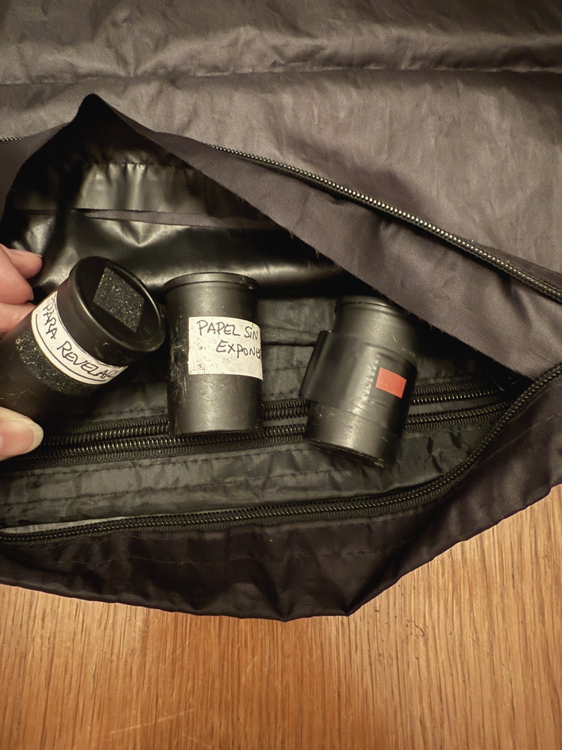 Cuando meto las manos en la manga, dentro tengo identificado cada potecito, uno con un pedacito de lija, que es donde pongo el papelito que saco de la camarita para revelar, el otro con un papel finito en el exterior es donde tengo los papelitos vírgenes para cargar la camarita (a veces llevo dos potecitos cargados de unas 10 o 15 papelitos cada uno).