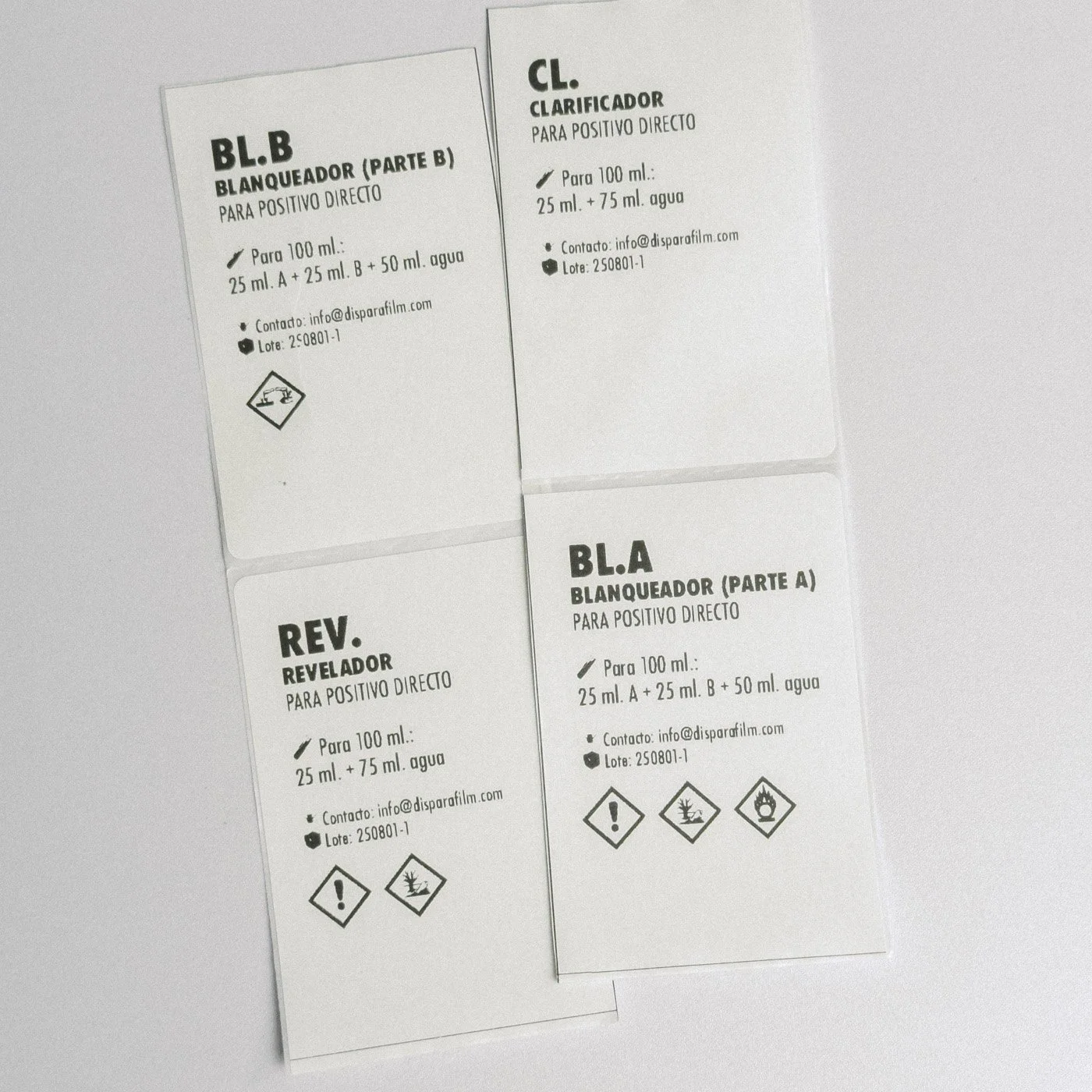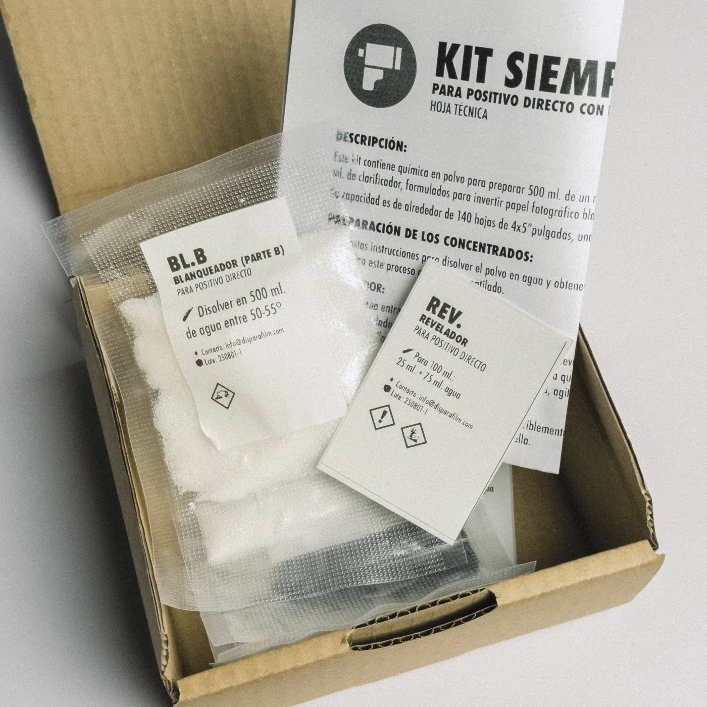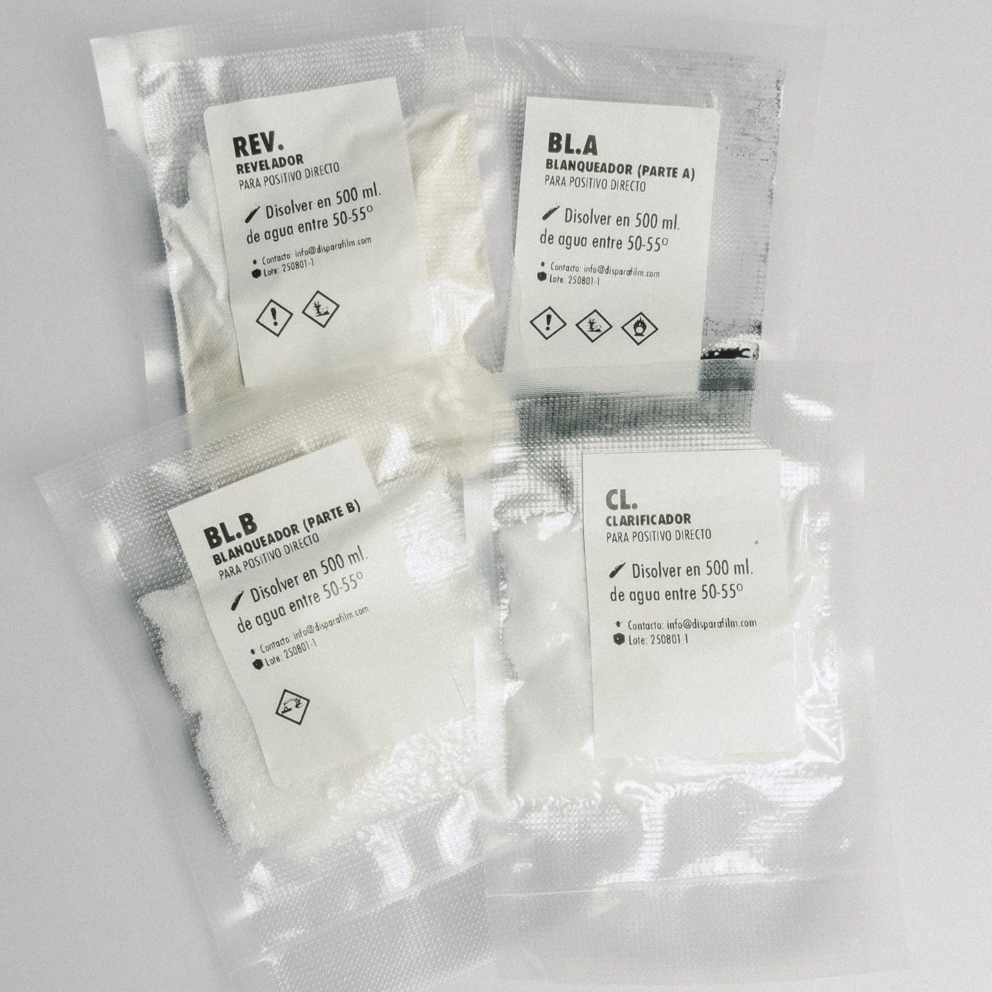 🧪 Química en polvo para preparar 2 litros de revelador especial de bajo contraste, 2 litros de blanqueador y 2 litros de clarificador.