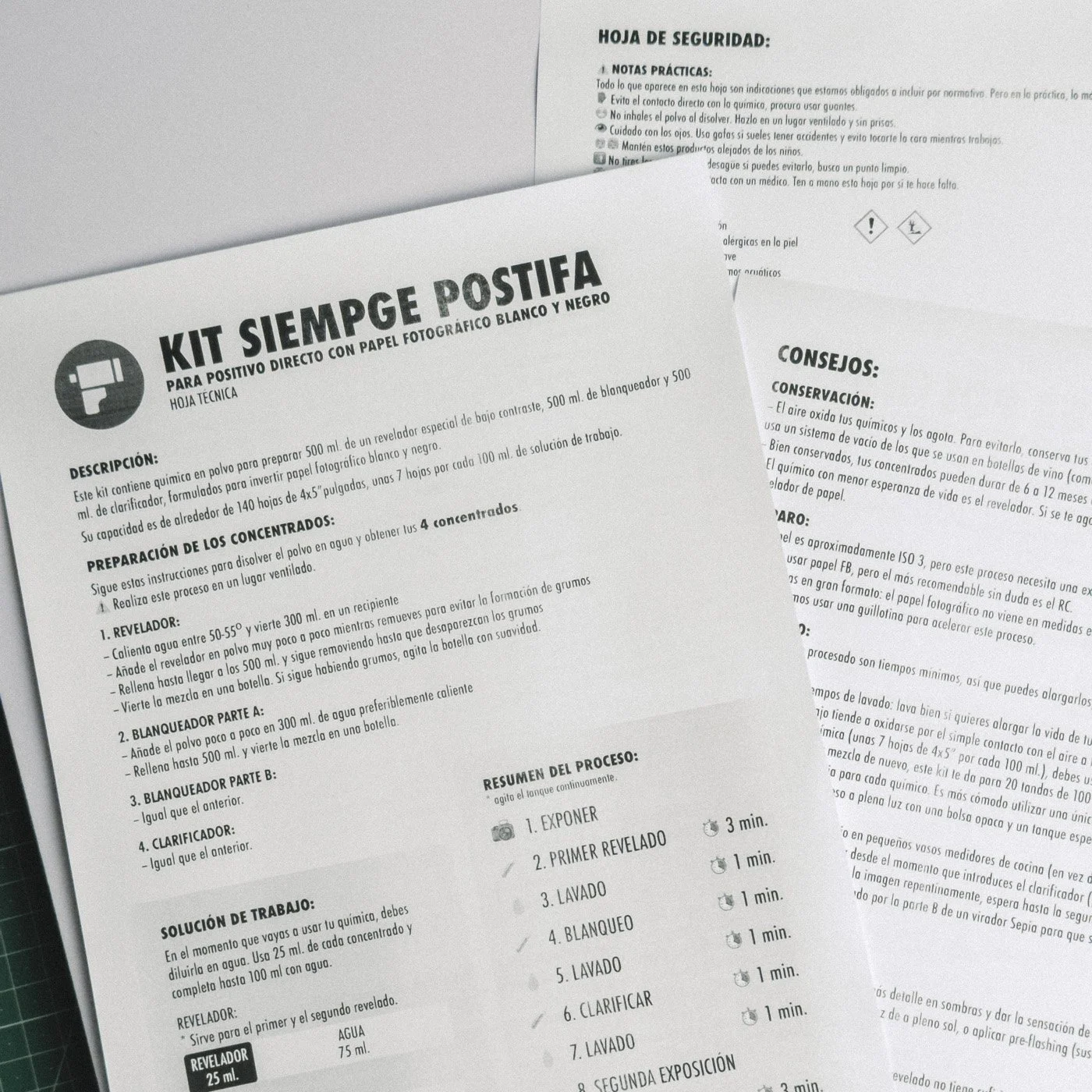 Con este kit puedes revelar fotos en papel fotográfico directamente en positivo. Puedes usar papel RC o FB.